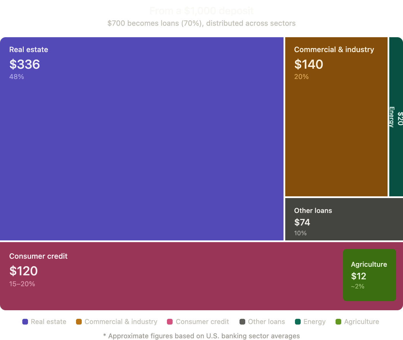 When someone deposits $1,000, nearly 70% of it becomes part of the lending that shapes the real economy: